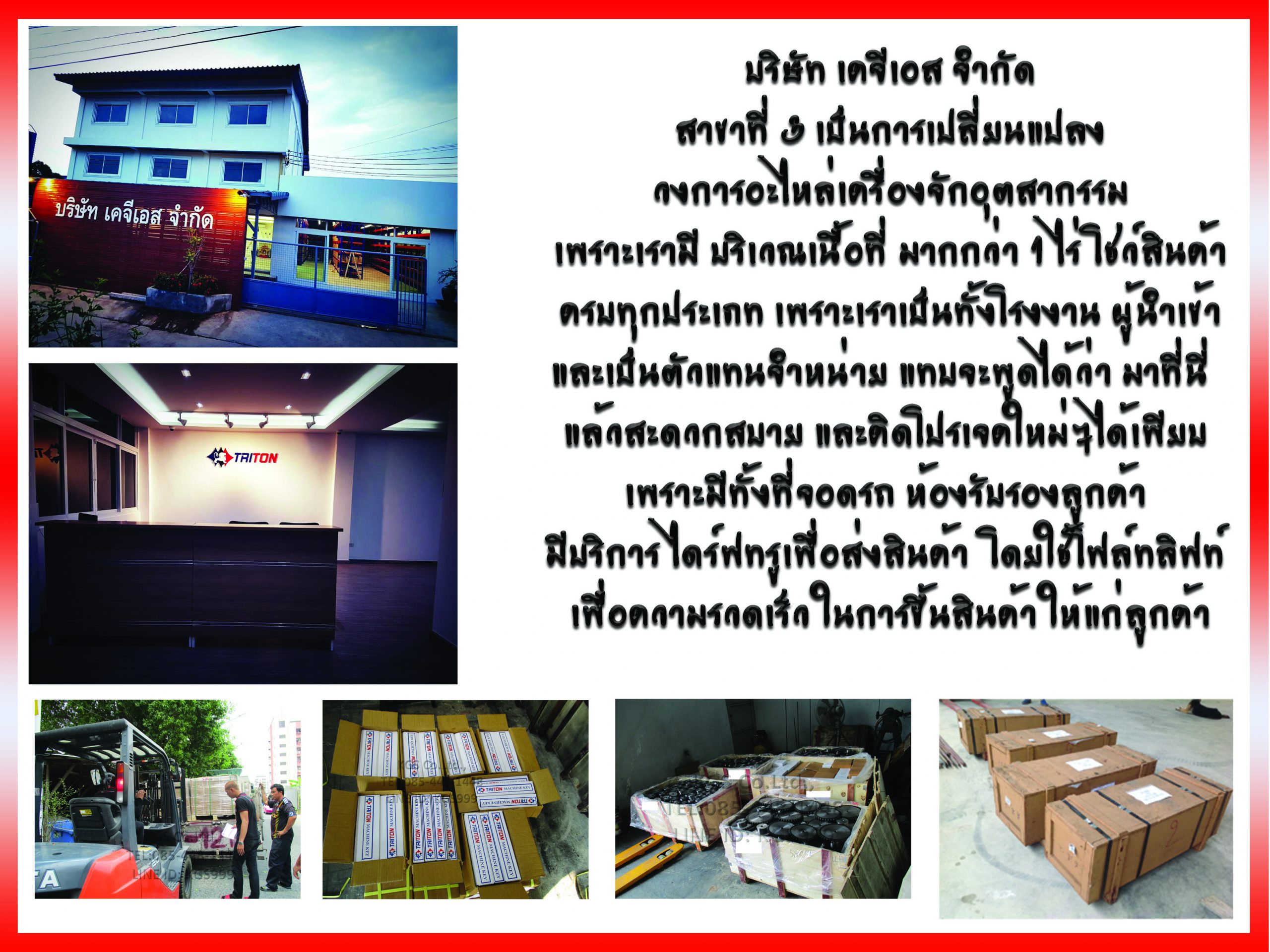 บริษัท เคจีเอส จำกัด สาขาที่ 1 สาขาน้องใหม่ ลูกค้าเรียกติดปากว่า “เคจีเอสโชว์รูม” สาขานี้ เป็นการเปลี่ยนแปลง วงการอะไหล่เครื่องจักรอุตสาหกรรม เพราะเรามี บริเวณเนื่อที่ มากกว่า 1ไร่ โชว์สินค้า ครบทุกประเภท แทบจะพูดได้ว่า เราเป็น อาณาจักรอะไหล่เครื่องจักรอุตสาหกรรมที่ใหญ่ที่สุดในสมุทรปราการ มีที่จอดรถกว้างขวาง มีห้องรับรองบริการให้แก่คุณลูกค้าทุกท่าน คุณลูกค้าที่ต้องการหาไอเดียแปลกใหม่ เพื่อสร้างเครื่องจักร หรือคุณลูกค้าที่ต้องการสินค้าใน ราคาขายปลีก ขายส่ง ต้องการสินค้าจำนวนมาก เรามีบริการ ไดรฟ์ทรู เพื่อส่งสินค้า โดยใช้โฟล์ทลิฟท์ เพื่อความรวดเร็วในการขึ้นสินค้า ให้แก่ลูกค้า การเดินทางสะดวก เพียงเข้ามาในซอยเทพารักษ์ 8 เพียง 500เมตร เท่านั้น