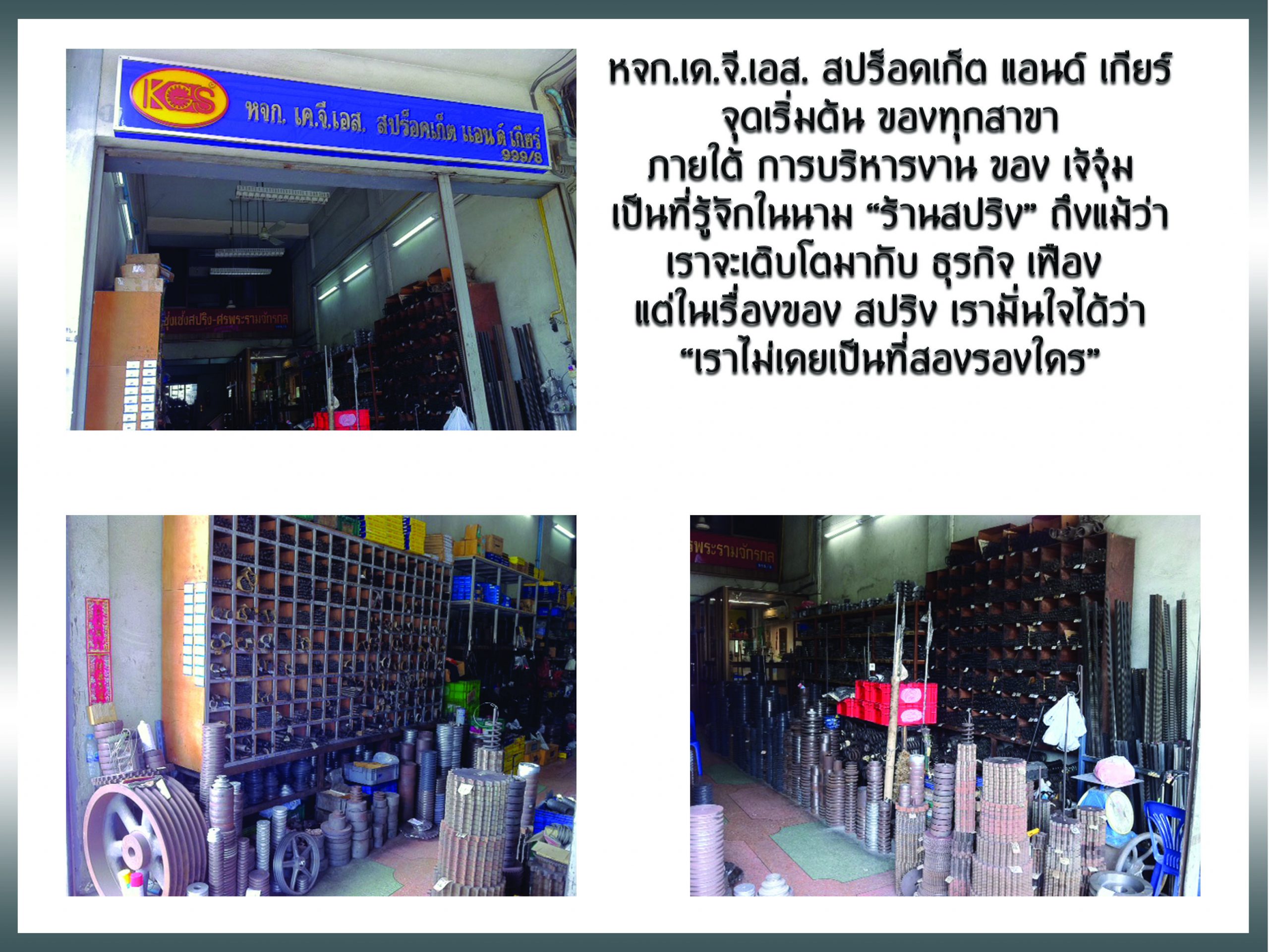 ห้างหุ้นส่วนจำกัด เค.จี.เอส.สปร็อคเก็ต แอนด์ เกียร์ สาขาต้นตำหรับ หรือที่คุณลูกค้าเรียกติดปากว่า “ร้านสปริง” เพราะนอกจากเราจะแม่นเรื่องเฟืองแล้ว เรื่องสปริงก็ไม่เคยเป็นที่สองรองใคร การเดินทางก็ใกล้นิดเดียวเพราะร้านของเรา ใกล้รถไฟฟ้า สถานีปู่เจ้า