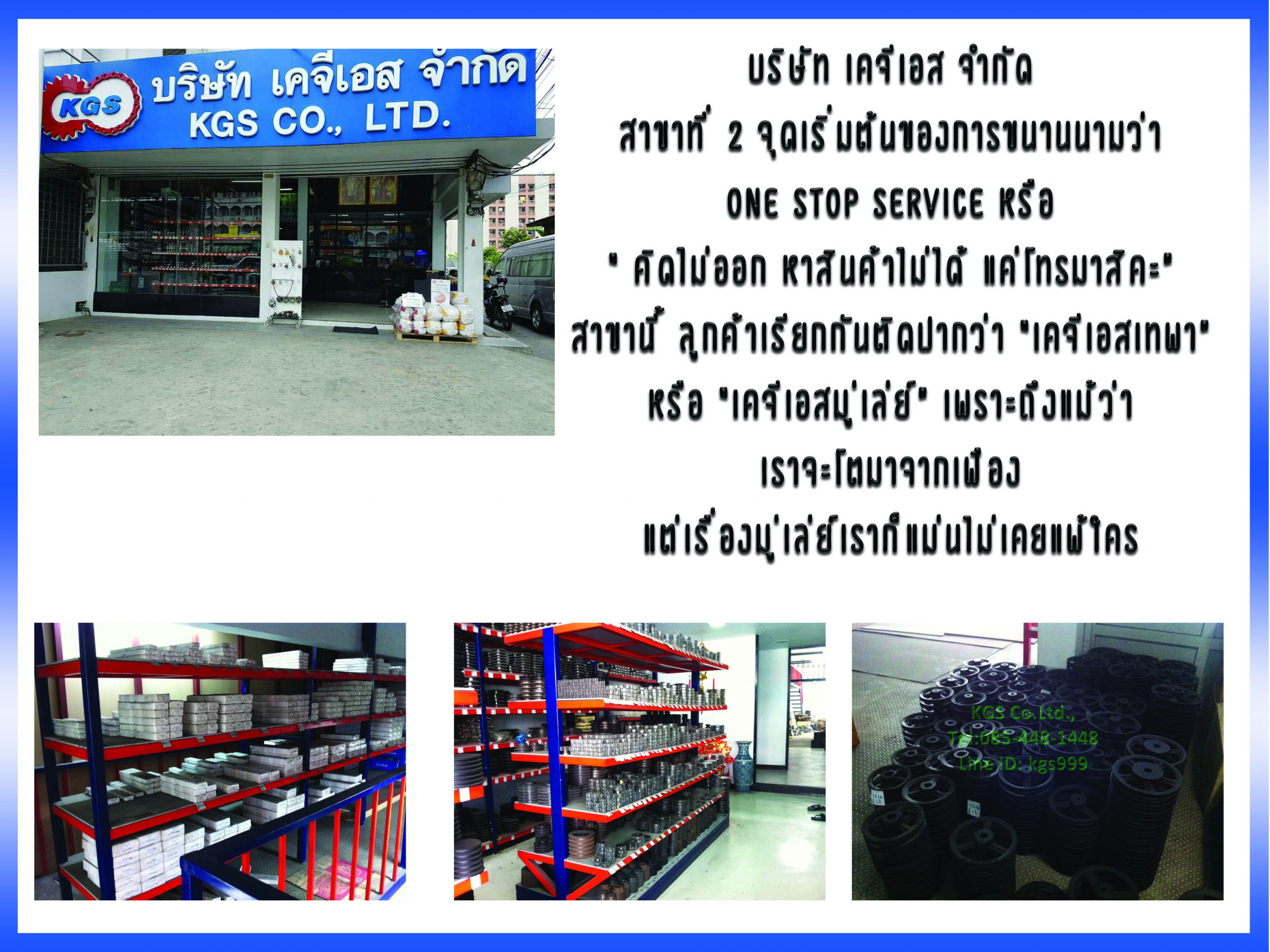 บริษัท เคจีเอส จำกัด สาขานี้ ลูกค้าเรียกกันติดปากว่า “เคจีเอสเทพา” หรือ “เคจีเอสมู่เล่ย์” เพราะถึงแม้ว่าเราจะโตมาจากเฟือง แต่เรื่องมู่เล่ย์เราก็แม่นไม่เคยแพ้ใคร เป็นสาขาที่ได้การขนานนามว่า one stop service หรือ เป็นที่มาของคำว่า “คิดอะไรไม่ออก หาสินค้าอะไรไม่ได้ โทรมาสิคะ” เพราะที่สาขานี้ เราสามารถเติมเต็มสินค้าแปลกๆ หรือหายาก ต้องสั่งผลิตพิเศษ เราสามารถ บริการให้แก่คุณลูกค้าได้ การเดินทางก็ง่าย และสะดวกสบายมาก เพราะร้านนี้ของเราติดถนนใหญ่ หัวมุม ซอยเทพารักษ์ 8 ระยะห่างประมาณ 1 กิโลเมตรก่อนออก ถนนสำโรง
